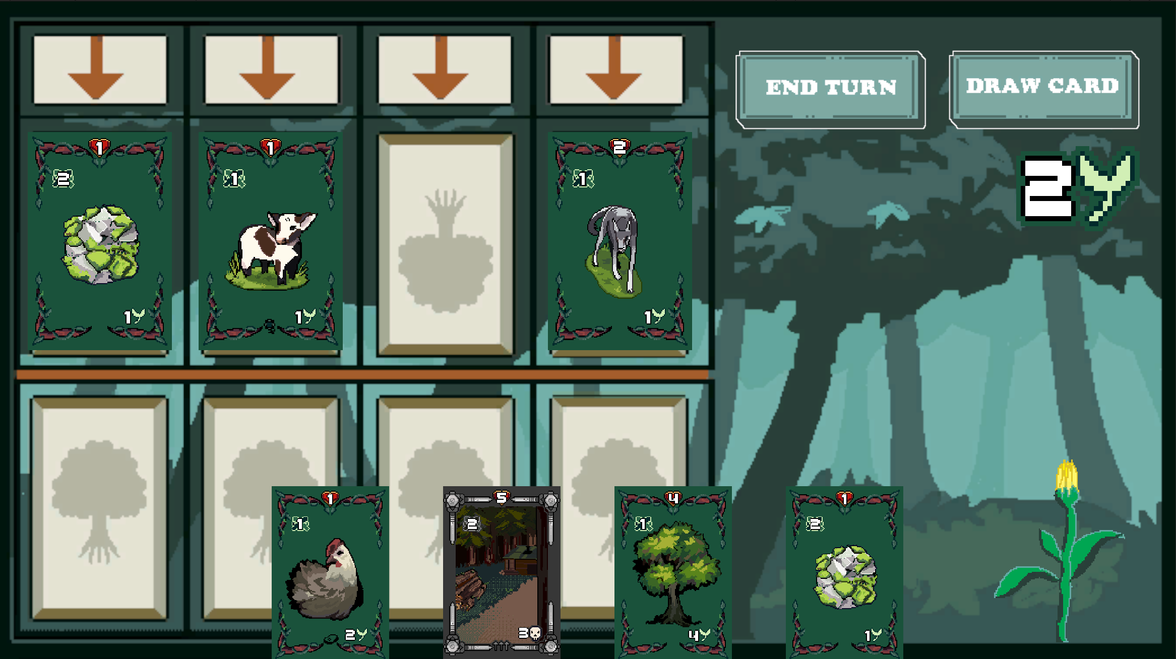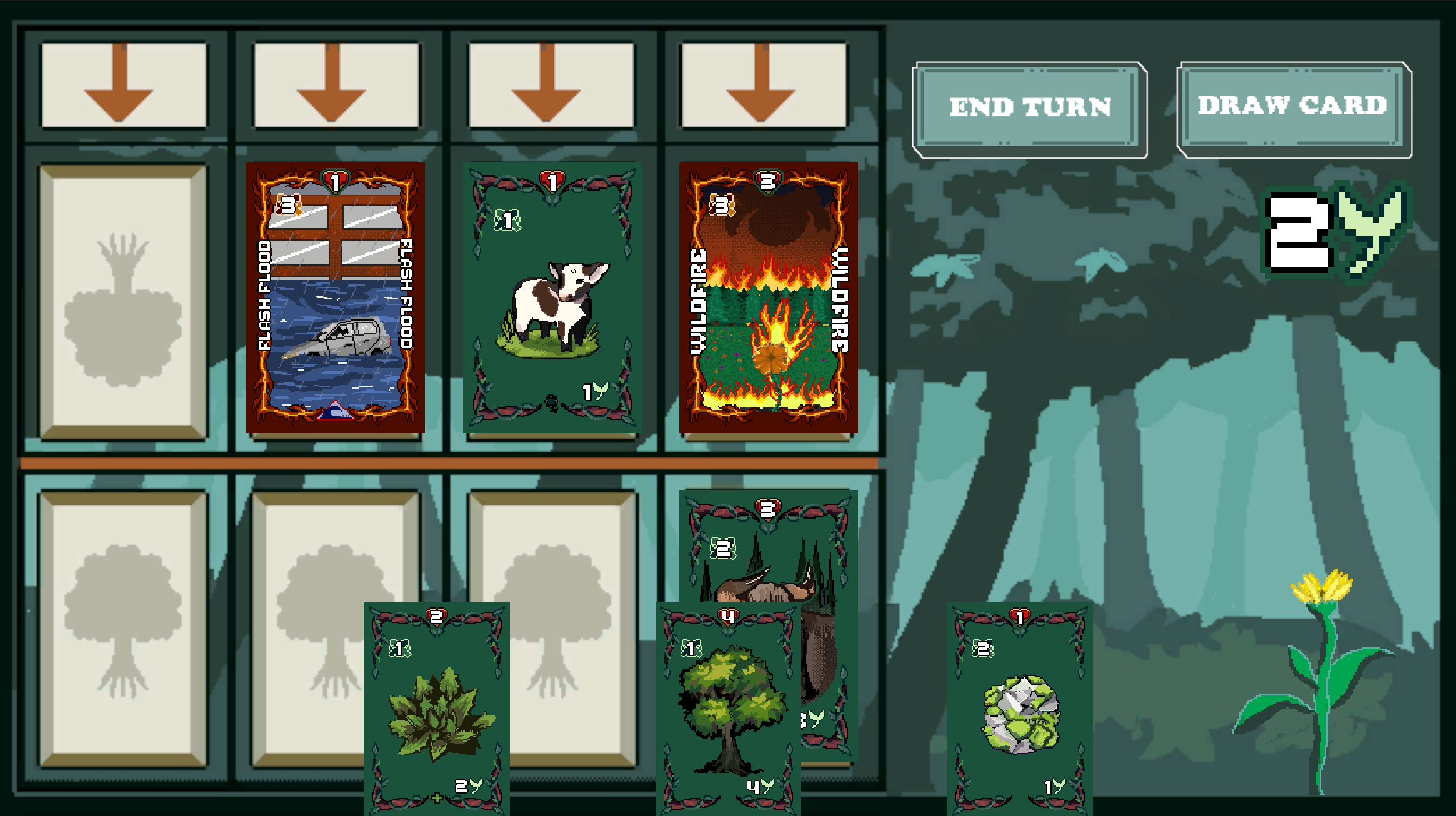 A gloomy day in the office turns into a very long night after a higher-up at a very big company gets rained in due to a big storm outside. A mysterious stranger visits the higher-up in the night, leaving him a flash drive containing a digital card game to play to help pass the time. With nothing better to do, the higher-up inserts the flash drive into his computer and opens Project Nevergreen on his computer, a deck-building roguelike, and battles against nature’s strongest elements. Nevergreen is a roguelike deckbuilding game focused on card combat. There are various ways to construct and use your deck to take on nature. Nevergreen is a commentary on how the consumption of resources by corporations is slowly killing the Earth as many of these resources are finite. There is an overlapping commentary on greenwashing which is the deceptive practice of making misleading claims about the environmental benefits of a product, service, or company to create a false impression of environmental responsibility. We hope this game can make players understand the consequences of overconsumption as well as how "environmental responsibility" is often overshadowed and overlooked in the name of profiteering.